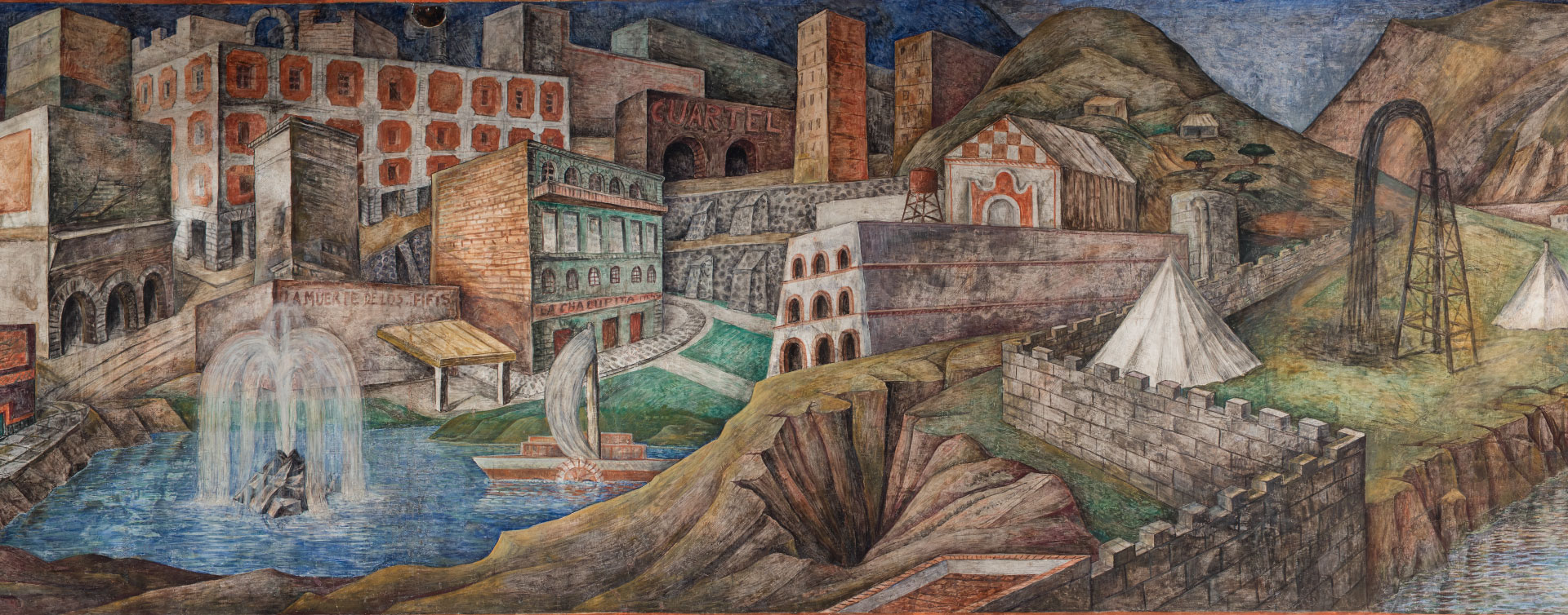 Al término de la Revolución Mexicana (1910-1917) el universo de la modernidad se concretó en las grandes ciudades, símbolo de civilización para las sociedades rurales. En este contexto, Juan O ́Gorman realizó la obra mural Paisaje de Azcapotzalco (1926), en la que narra la conformación de la localidad, su historia y sus transformaciones en un código visual extenso, con imágenes reales-fantásticas de un mundo detenido en un tiempo y espacio precisos. Desde el campo de lo pictórico retrató el avance de aquella modernidad sobre el panorama rural, para lo que usó una composición de contraste que evidencia ambos tipos de paisaje; en su elaboración contó con el apoyo de su amigo Julio Castellanos, otro pintor destacado del siglo XX, y de Hermilio Jiménez como asistente.